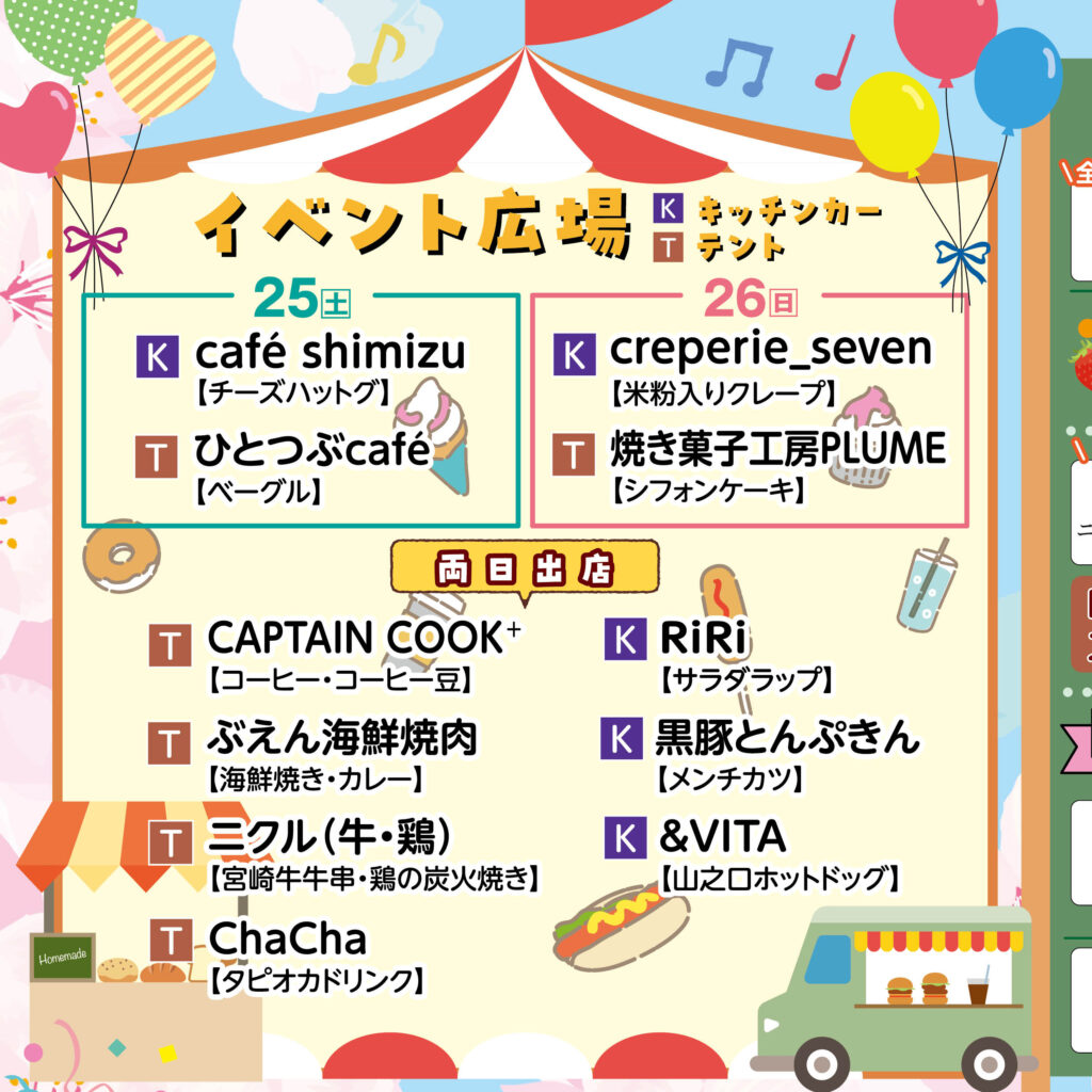 さらに両日ともに、コーヒーや海鮮焼き、宮崎牛串、タピオカドリンクなど、食べ歩きにぴったりのメニューが揃います。